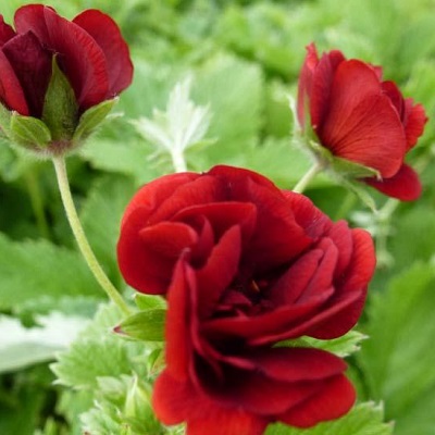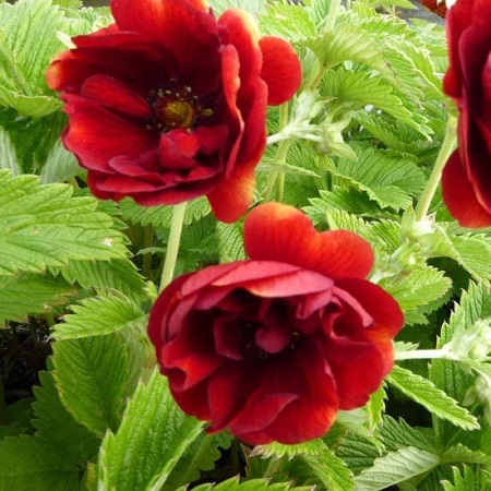 Многолетнее растение с вертикальным или косым корневищем. Лапчатка гибридная 'Flamboyant'-Цветки 4 см диаметром полумахровые, тёмно-красные. Высота 30-40 см.Период цветения июнь-август. Идеальное почвопокровное растение. Нижняя листва лапчатки гибридной на длинных черешках, тройчатая, реже пальчатая, острозубчатыми по краю; стеблевая — сидячая, тройчатая.