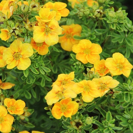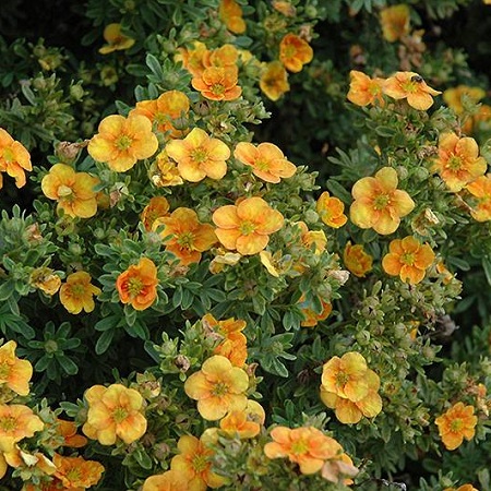 Очень красивый сорт лапчатки кустовой. Куст высотой до 50 см. Крона аккуратная, плотная. Цветки двуцветные оранжево-красные с яркой желтой серединой.