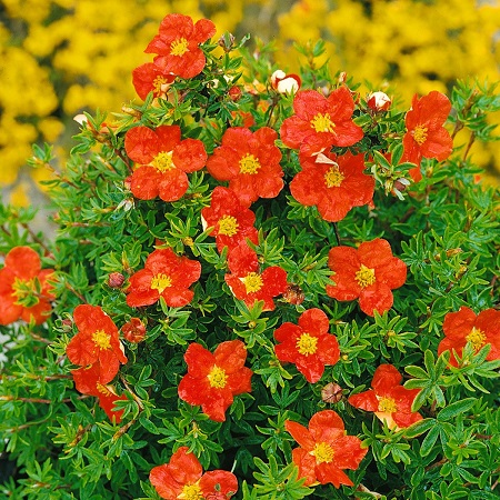 Самый яркий сорт лапчатки кустарниковой. Высота до 0,6 м. Куст небольшой и очень компактный. Цветы ярко-красные, не выгорающие на солнце. Цветение начинается в середине июня и длится до настепления устойчивых заморозков в начале октября.