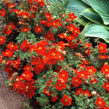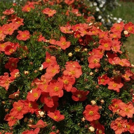 Густой кустарник лапчатки высотой до 1 м, Цветки многочисленные, крупные, до 5 см в диаметре, красные, иногда в зависимости от места посадки приобретают оранжевый оттенок. Цветение очень обильное с июня по октябрь.