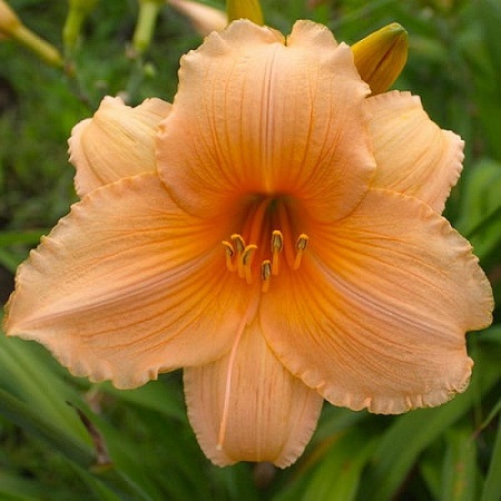 Травянистый корневищный многолетник. Цветоносы до 55 см высотой, жёлтые с розовым оттенком и золотисто-желтым горлом, возвышаются над листьями. Диаметр цветка 13 см. Период цветения июль-август.
