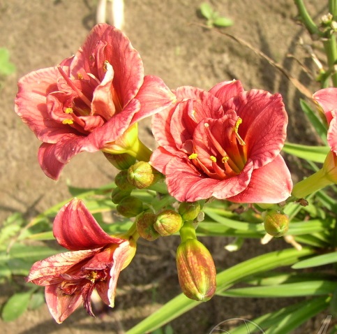 Эффектный многолетник с крупными яркими цветами до 15 см в диаметре , насыщенно розово-красного цвета и ярко-желтым горлом. Высота до 45 см. Время цветения июль-август