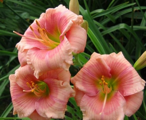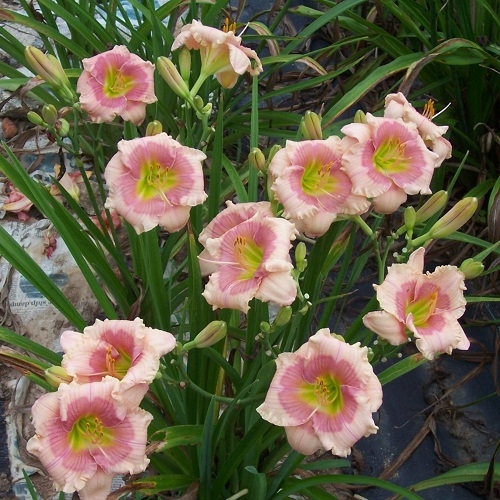 Многолетник высотой 50-55 см. Цветок диаметром 12 см. Гофрированный светло-розовый с лиловым глазком и зеленым горлом. Период цветения - июль.