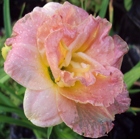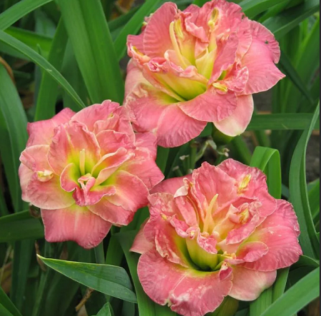 Махровый двухцветный цветок кораллового тона с зеленым горлом. Высота около 50 см, диаметр цветка 10 см. Среднего срока цветения (июль-август).Диплоид, вечнозеленый, повторноцветущий.