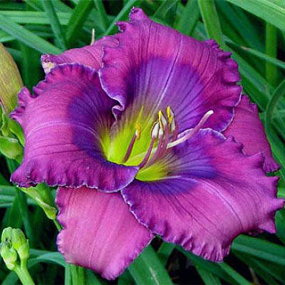 Лилейник высотой 60-70 см. Цветок махровый, гофрированный, сиреневый с лилово-голубым глазком. Горло зеленоватое. Спящий, диплоид, повторноцветущий. Ароматный. Диаметр цветка до 14 см. Цветет с конца июля по сентябрь.