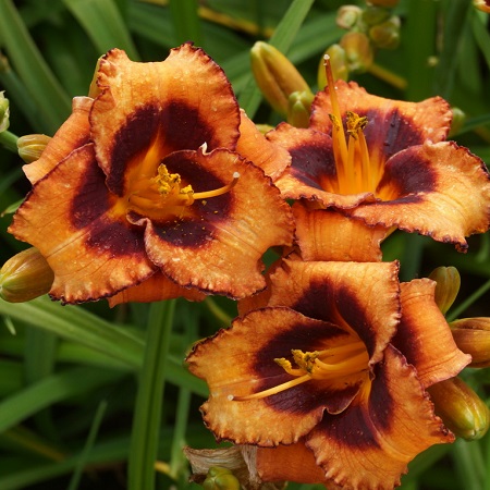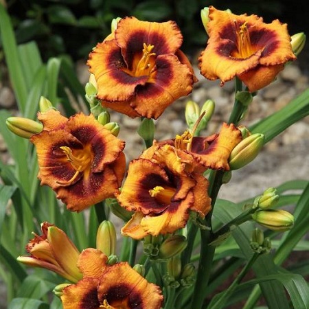 Лилейник высотой 40-60 см. Цветки ярко-оранжевые с темно пурпурным глазком и тёмно-фиолетовой каймой диаметром около 8 см. Тетраплоид. Повторноцветущий. Цветет с конца июля по сентябрь.