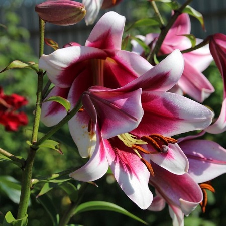 Многолетнее луковичное растение с прямыми и крепкими облиственными стеблями. Цветок с пурпурно-розовой неоновой центральной частью и строгими белыми краями лепестков. Пыльники на тычинках коричневые, с бордовым оттенком. Период цветения июль-август.
