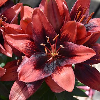 Низкорослый азиатский гибрид лилии. Лепестки светящиеся кораллово-красные с темным, почти черным танго пятном. Высота взрослого растения 45 см. Диаметр цветка 15 см. Период цветения июнь-июль.