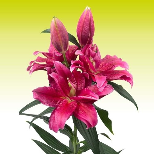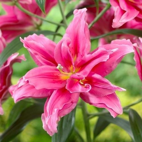 Розовидная восточная лилия Далинда поразит вас своим великолепием. Большие, до 20 см в диаметре, махровые цветки светло-малинового оттенка распускаются в середине лета и радуют окружающих своей красотой и невероятным ярким ароматом. Высота растения достигает 100 см. Цветки не производят пыльцу, поэтому сорт можно выращивать и в теплице, и дома.