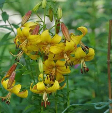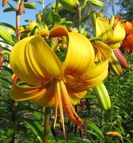 Многолетнее луковичное растение с прямыми и крепкими облиственными стеблями. Лепестки крупные, слегка согнутые вверх. Обладает желтым окрасом, Внутри преобладает оттенок красновато-оранжевый с небольшим крапом. Период цветения июль-август.