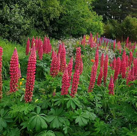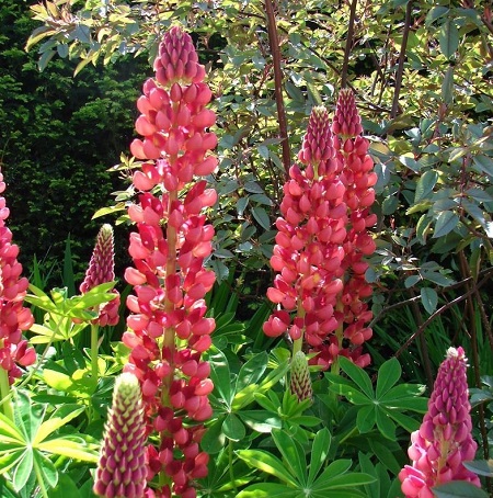 Травянистое растение высотой 80-120 Стебли прямые, прочные, почти голые. Листья пальчатые, на длинных черешках, с 9-15 снизу опушенными листочками. Цветки красные с белым , собраны в многоцветковые кистевидные соцветия 30-35 см длиной. Цветет в июне 20-30 дней, если удалять отцветающие соцветия — вторично в августе.