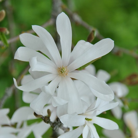 Листопадный кустарник высотой до 3 метра. Сорт морозостойкий способный выдержать до -30 градусов. Крона шаровидная. Молодые побеги и почки густо опушены. Листья овальные, грушевидные длиной до 12 см, тёмно-зелёные, осенью желтеют. Цветы крупные, до 10 см в ширину, очень похожи на ромашку – белые лепестки длинно-овальной формы в количестве 12-18 штук. Цветет задолго до появления листьев, продолжительно. Время цветения: середина-конец мая. Растет медленно.