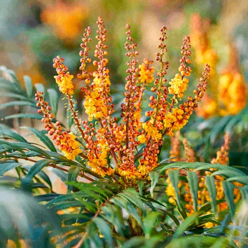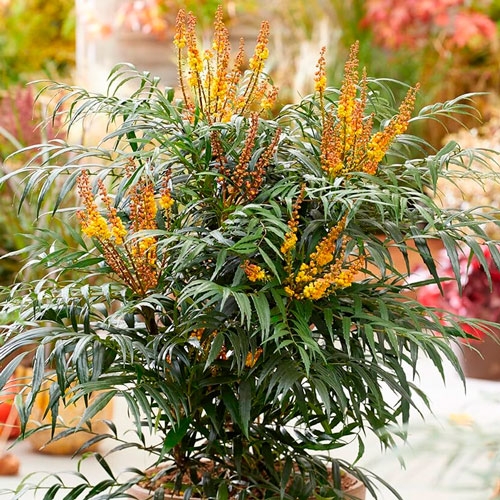 Вечнозелёный компактный кустарник высотой 60-90 см с густой округлой кроной. Листья сложные, кожистые, тёмно-зелёные (молодые приросты бронзово-красные), осенью приобретают пурпурно-фиолетовые оттенки. Цветки ярко-жёлтые, мелкие, собраны в плотные кистевидные соцветия (длиной 5-8 см), с лёгким ароматом; цветёт в апреле-мае. Плоды — сине-чёрные ягоды с восковым налётом.