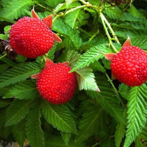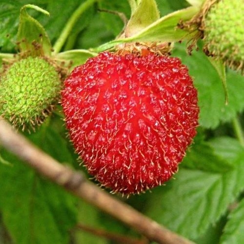 Очень декоративны плоды - сочные многокостянки 3-4,5 см диаметром, округлой или широкоэллиптической формы, светящегося кораллово-красного цвета. Размером и внешним видом они, действительно, напоминают клубнику, но легко отделяются от цветоложа, как малина. По вкусу они не похожи ни на ту, ни другую ягоду, кисло-сладкие и слегка ароматные. Многие описывают их как невкусные, сладость и аромат раскрываются только при полном созревании. В сыром виде их много не съешь, но для домашних заготовок и виноделия, где кислинка просто необходима, это ценная ягода. Полукустарник от 30 до 60 см высотой, с ползучим корневищем, дающим новые побеги на расстоянии более полуметра от куста, образует заросли. Имеет несколько вертикальных травянистых стеблей с зеленой корой, древеснеющих лишь у самого основания. Листья очередные, черешковые, перистые, состоят из 3-7 зубчатых по краю продолговато-ланцетных листочков 3-8 см длиной. Стебли и черешки листьев покрыты загнутыми цепляющимися шипами. Цветки довольно крупные, пятилепестные, 2,5-4 см диаметром, белые, обоеполые, в малоцветковых соцветиях, расположенных на верхушках стеблей, иногда одиночные.