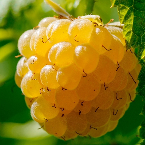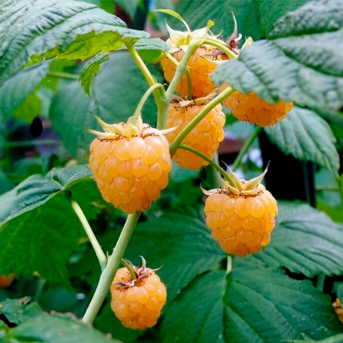 Кусты вырастают до 1,8 метра и имеют прямые побеги. Они крепкие и мощные, поэтому способны удерживать ягоды без дополнительной опоры. Шипы на кустах встречаются редко и не причиняют неудобств. Листья у растения крупные, гофрированные и тёмно-зелёные. Ягоды конусообразные, большие — весят от 6–8 до 10–11 граммов. Спелые плоды жёлтые с оранжевым отливом. Мякоть сочная, а вкус сладкий, медовый. Благодаря плотному сцеплению костянок урожай может храниться в холодильнике до 7 дней и транспортироваться на дальние расстояния для продажи. Сорт «Золотая Зюгана» не содержит красного фермента, поэтому он считается гипоаллергенным. Его можно употреблять людям с аллергией, беременным женщинам и детям. Этот сорт даёт высокий урожай — до 6 килограммов ягод с куста. Созревание плодов происходит в средние сроки: первая волна плодоношения приходится на июль, а вторая начинается в сентябре и продолжается до октября.