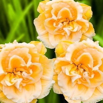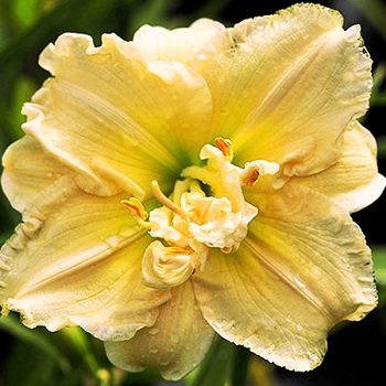 Лилейник высотой 30-40 см. Цветки нежные, махровые, кремово-желтого цвета, с зеленоватым горлом, на каждом лепестке волнистый бахромчатый край почти белого цвета. Диаметр цветка до 14 см. Цветет с конца июля по сентябрь.