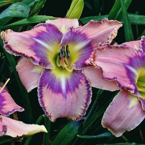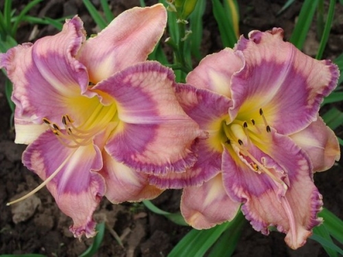 Эффектный многолетник высотой 60-70см. Цветки крупные, до 15 см в диаметре, светло-красно- пурпурные, с эффектным желтым горлышком и рифленым краем. С широколинейными прямыми или дуговидно изогнутыми листьями. Цветет с конца июля по сентябрь.