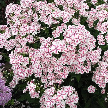 Флокс метельчатый Twister — эффектный сорт с контрастными полосатыми лепестками, напоминающими карамельную «вертушку». Бело-розовые цветки с малиновым глазком создают живой акцент в саду и цветут обильно с июля по сентябрь. На фото флокса Twister видно, как нарядно он смотрится в цветниках и бордюрах.