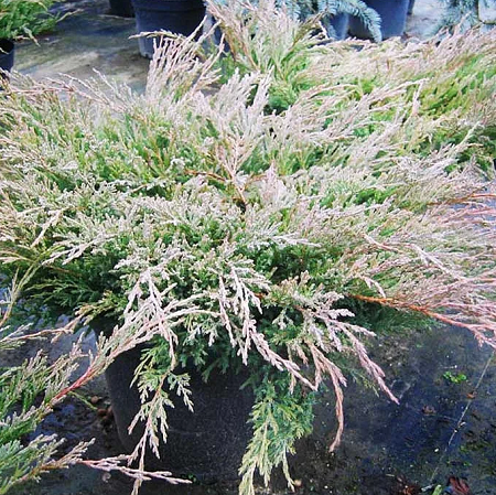 Карликовая форма можжевельника горизонтального. Высота до 0,3 м при диаметре кроны до 1 м. Крона имеет подушковидную форму. Хвоя чешуйчатая, голубовато-серая.