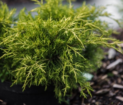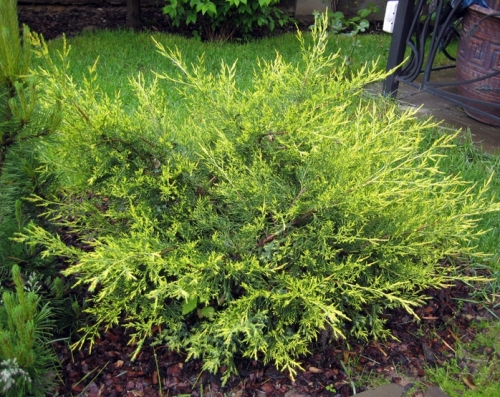 Хвойный вечнозеленый кустарник, достигающий во взрослом состоянии и в высоту и в диаметре двух метров. Растет довольно медленно 4-5 см в год. Крона мохнатая широкораспростертая, очень декоративная: молодые побеги – настоящее золото на фоне зеленой более старой хвои. Хвоя чешуйчатая желто-зеленая. Плоды – шишкоягоды: молодые бело-зеленого цвета, взрослые – черные с сизым восковым налетом. Имеет хорошую репутацию неприхотливого растения, поэтому широко распространен и активно используется в ландшафтном дизайне больших городов, парков и загородных усадеб.