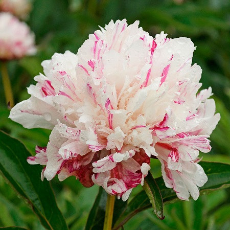 Отличный сорт для коллекционеров. Высота куста 70-80 см, Цветок эффектный, махровый, диаметром 15-17 см., лепестки белые с малиновыми штрихами. Цветение обильное, аромат приятный. Период цветения май-июнь.