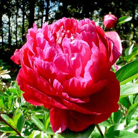 Махровый пион, сверкающий своими гранями, соцветия имеют пурпурно-красную окраску. Их аромат умеренный, наполненный сладкими нотками. Куст высокий 80-90 см, с очень крепкими стеблями. Листва темно-зеленая, блестящая. Этот пион относится к сортам средне-позднего срока цветения. Подходит для озеленения сада и срезки.