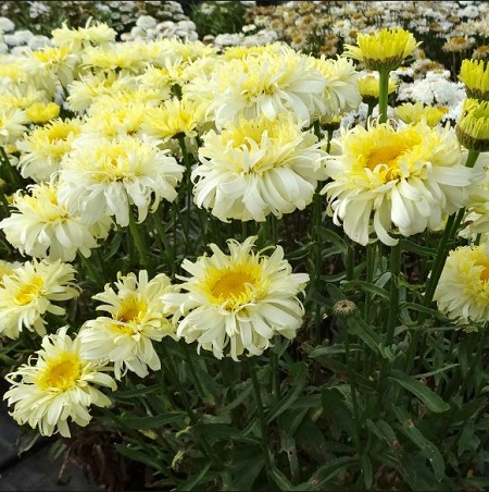 Высота растения в цветущем состоянии 40-60 см, куст компактный, с темно-зеленой резной листвой Цветки сливочно- лимонные, крупные, полумахровые цветы с яркой золотой серединой и игриво-закрученными тонкими лепестками в центре. Обильное цветение в июне-июле.