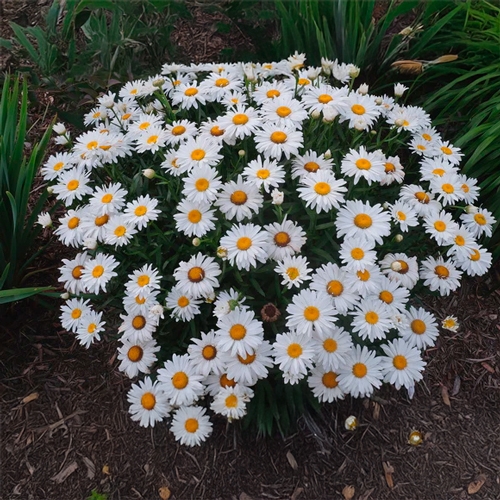Эффектный многолетний сорт нивяника с крупными белоснежными соцветиями. Формирует плотные кусты высотой 60–70 см с крепкими прямостоячими стеблями и тёмно-зелёными продолговатыми листьями. Главная особенность сорта – огромные (8–10 см в диаметре) махровые и полумахровые цветки с белыми лепестками и золотистой сердцевиной, напоминающие изящные ромашки.