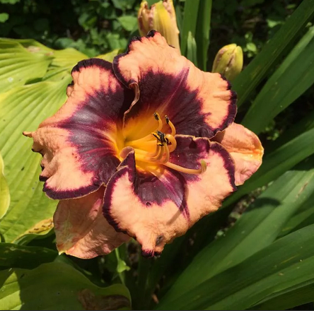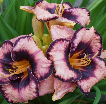 Цвет орхидейный со сливово-фиолетовым глазком и зеленым горлом. Вечнозеленый, повторноцветущий. Высота растения - 58cм, диаметр цветка-15см. Период цветения июнь-август.