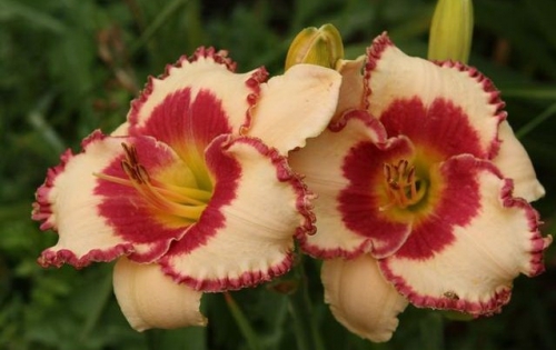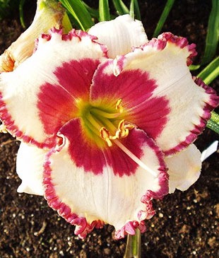 Травянистый корневищный многолетник. Цветоносы до 65 см высотой, кремово-жёлтый с красной окантовкой и глазком, горло зелёное, гофрированный, повторное цветение. обычно возвышаются над листьями. Период цветения июль-август