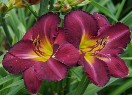 Многолетнее травянистое корневищное растение высотой до 85 см. Цветки темно-вишневые с золотисто-салатовым зевом, гофрированные по краям до 15 см в диаметре, лепестки плотные, широкие. Цветет в июле - августе.