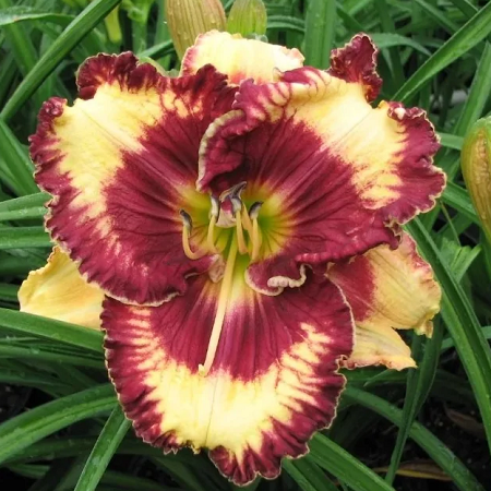 Высота: 40-60 м Цветок: тёмно-фиолетовый с зелёным горлом. Лепестки с жёлтыми кончиками, гофрированные Период цветения: июль-август Место посадки: солнце, полутень.