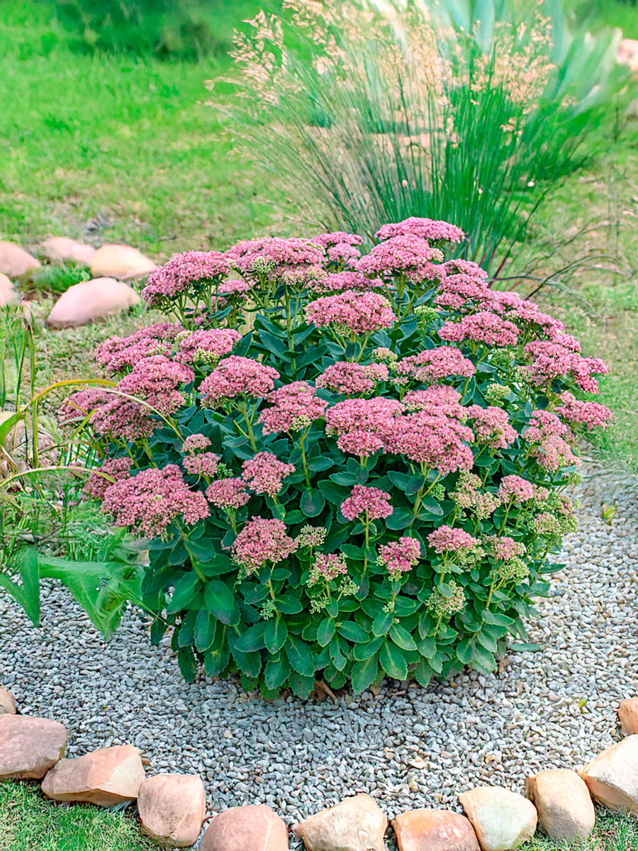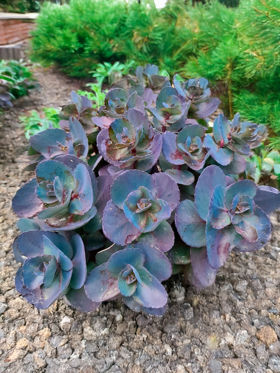 Компактный многолетник высотой 40–50 см и шириной до 60 см. Листва овальная, мясистая, голубовато-сизая с лёгким пурпурным оттенком, сохраняет декоративность весь сезон. Соцветия крупные, щитковидные, розово-пурпурные, цветение продолжается с августа по о Купить саженцы Очитка / Седум.