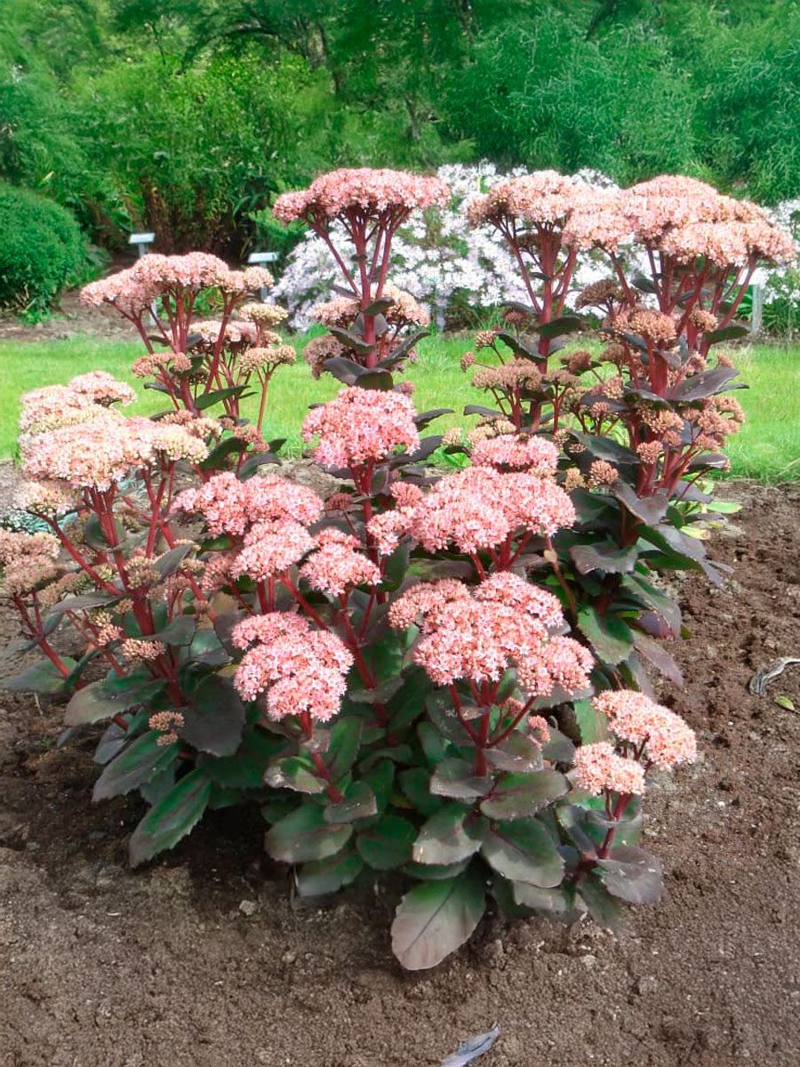 Многолетник высотой 40–60 см и шириной до 60 см. Листва овальная, мясистая, сизо-зелёная с голубоватым оттенком. Соцветия крупные, в процессе цветения меняют окраску от розовой до медно-красной. Цветение продолжается с августа по октябрь. Купить саженцы Очитка / Седум.