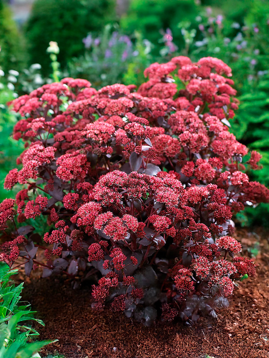 Компактный многолетник высотой 40–50 см и шириной около 50 см. Листва овальная, мясистая, тёмно-зелёная с пурпурным оттенком. Соцветия плотные, винно-красные. Цветение — август – октябрь. Купить саженцы Очитка / Седум.