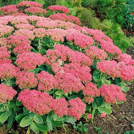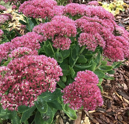 Многолетник высотой 30-50 см. Листья крупные, мясистые, светло-зеленого цвета. Мелкие цветки темно-розового цвета собраны в большие щитковидные соцветия на концах побегов. Цветение очень продолжительное и обильное. Время цветения: август-сентябрь.