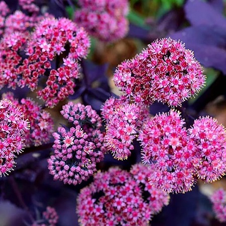 Многолетник высотой 40-50 см. Листья крупные, мясистые, светло-зеленого цвета. Весной покрытый многочисленными пурпурными, красными и коричневыми листиками, в летнее время он полностью окрашивается в глубокий шоколадный цвет. На концах побегов распускаются щитковидные соцветия с розовыми цветками. Время цветения: август-сентябрь.