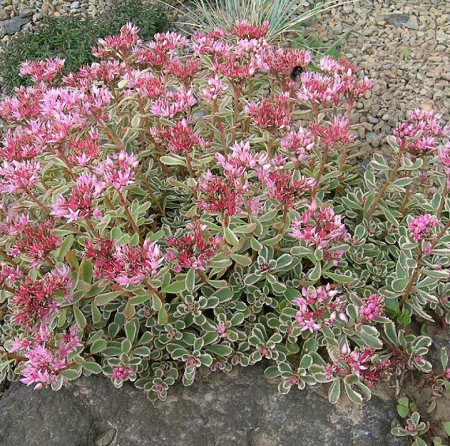 Многолетник высотой 10-15 см, цветет в июле-августе розовыми цветками. Имеет зеленые листья с кремовой каймой, которая на солнце приобретает по краю винно-красный цвет.