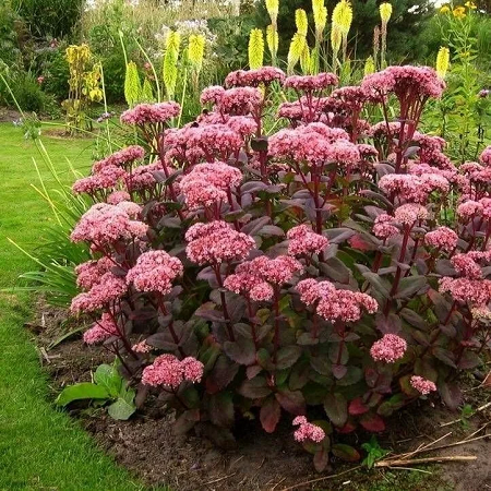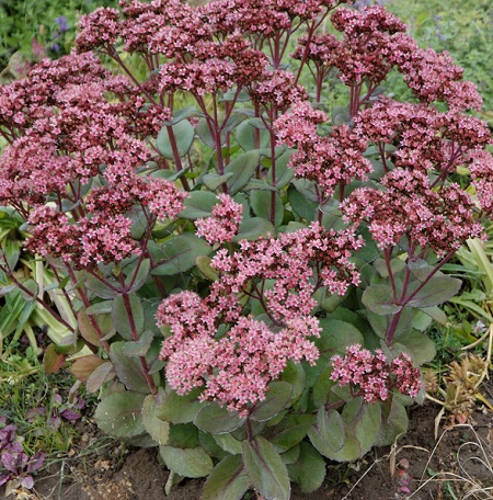 Многолетник высотой 40-50 см. Стебли крепкие, прямостоячие, листья мясистые, овальные, красивого бордового цвета с сизоватым налетом. Цветки темно-красные, мелкие, собраны в большие щитковидные соцветия. Время цветения: конец июля-начало сентября.