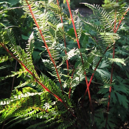 Великолепное пушистое многолетнее растение с перистыми листочками, окрашенными в ярко-зеленый цвет. Благодаря тонким и узким перышкам листьев, которые мягко колышутся на ветру, небольшой куст кочедыжника, не превышающий полуметра в высоту, имеет привлекательную ажурную крону. Стебли у этого растения имеют декоративную темно-фиолетовую с краснотой окраску.