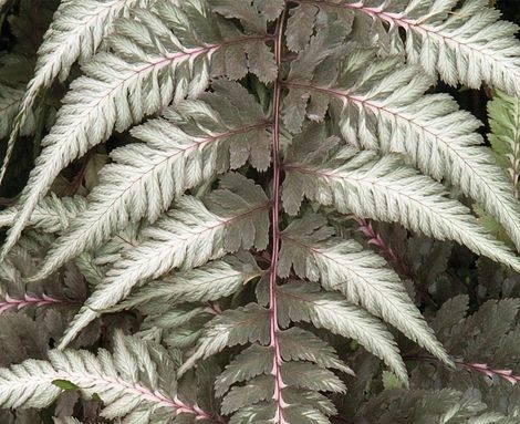 Папортник высотой до 45 см. Листья серовато-зеленые с наложением серебристых оттенков, подчеркнутых контрастными темно-бордовыми средними жилками. Окрас листьев стабилизируется на 3-й год поле посадке, лучше проявляется в светлой полутени.