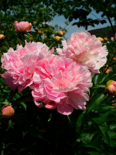 Из-за большого веса цветов установите кольцевую или многостороннюю опору ранней весной — это позволит сохранить форму куста и предотвратить полегание побегов в дождливую или ветреную погоду. Пионы особенно отзывчивы на фосфорно-калийные подкормки в фазе бутонизации.