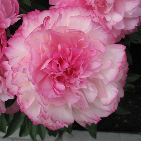 Яркий, махровый шаровидный пион высотой до 95 см. Цветок вначале цветения насыщенно розовый, со временем светлеет, а по краям лепестков остается розовая кайма. Диаметр цветка в реднем 16-18 см. Листья тёмно-зелёные, крупные, блестящие. Аромат приятный. Период цветения май-июнь.