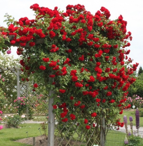 Необыкновенная красная плетистая роза, притягивающая к себе внимание своим пышным, волнообразным цветением и крупными, чашевидными, потрясающе красными, махровыми цветками. Они распускаются из округлых, темно-красных бутонов в соцветиях по 5-7 шт., обладают легким ароматом шиповника, отлично переносят дождь и жару. Куст мощный, прямостоячий, сильнорослый. Листва темно-зеленая, глянцевая, прекрасно контрастирует с сияющее-красными цветками, выделяя их на своем темном фоне. Сорт характеризуется очень хорошей морозостойкостью и хорошей устойчивостью к заболеваниям. Розу Amadeus (Амадеус) можно выращивать в качестве живой изгороди, а так же для украшения беседок и стен различных построек.