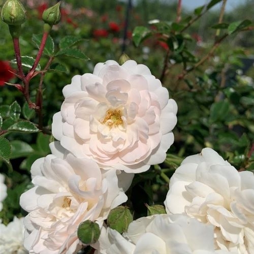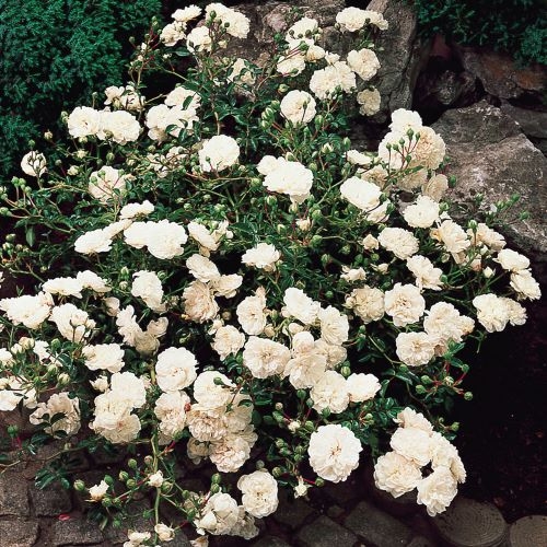 Это – первая почвопокровная роза, выведенная Мейяном, и до сих пор считается одной из лучших. Swany сочетает гены двух вечнозеленых роз, Rosa sempervirens и Rosa wichurana, Однаконе унаследовала свойства сильнорослой плетистой розой, а формирует раскидистый обильноцветущий куст. Цветки 5-6 см в диаметре чистого белого цвета, с нежно-розовым тоном в центре, когда только распустятся, густомахровые, в форме розеток. Появляются в кистях по 5-20 шт на довольно длинных стеблях. Аромат цветов очень легкий, практически незаметный.