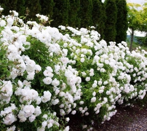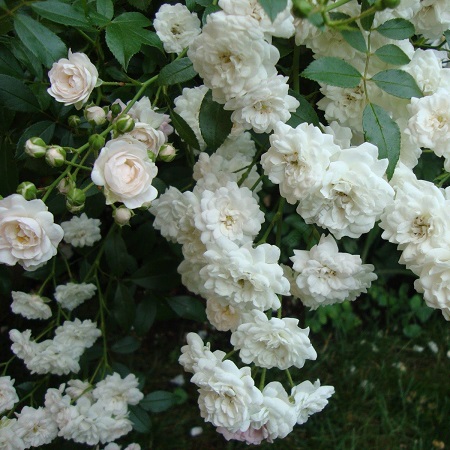 Цветы появляются в длинных, воздушных кистях по 10-40 шт. Листва бледная, куст раскидистый, разрастается в стороны с возрастом. Цветет массой мелких махровых цветочков. Листва мелкая, ярко-зеленая, блестящая. Куст раскидистый, ветвистый, до 1,2 м шириной и 50-70 см высотой. Цветет очень обильно. Цветение начинается позже, чем у большинства роз. Сорт может использоваться в качестве почвопокровного растения.