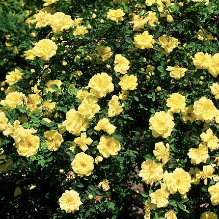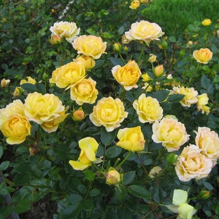 Красивая почвопокровная роза. Цветки густомахровые, в кистях по 3-8 шт, покрывают всю поверхность растения. Они ярко-желтые когда только раскроются, с золотыми и янтарными тонами ближе к центру, но за пару следующих дней выгорают до лимонных и кремовых. Отцветшие цветки не осыпаются, а имеют тенденцию засыхать на кусте, но это не такой серьезный дефект, т.к. на месте старых всегда распускаются новые розочки. Куст открытый, красивой формы, с мелкой темно-зеленой листвой.