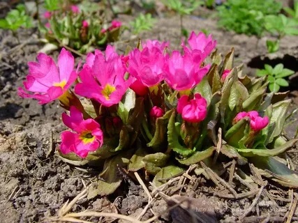 Цветки ярко-карминно-розовые с жёлтым глазком, собраны в большие рыхлые соцветия. Листья в розетках, высотой 15 см, удлинённо-овальные, гладкие, с зубчатым краем. Цветоносы толстые, высотой 30 см. Цветет в апреле-мае.