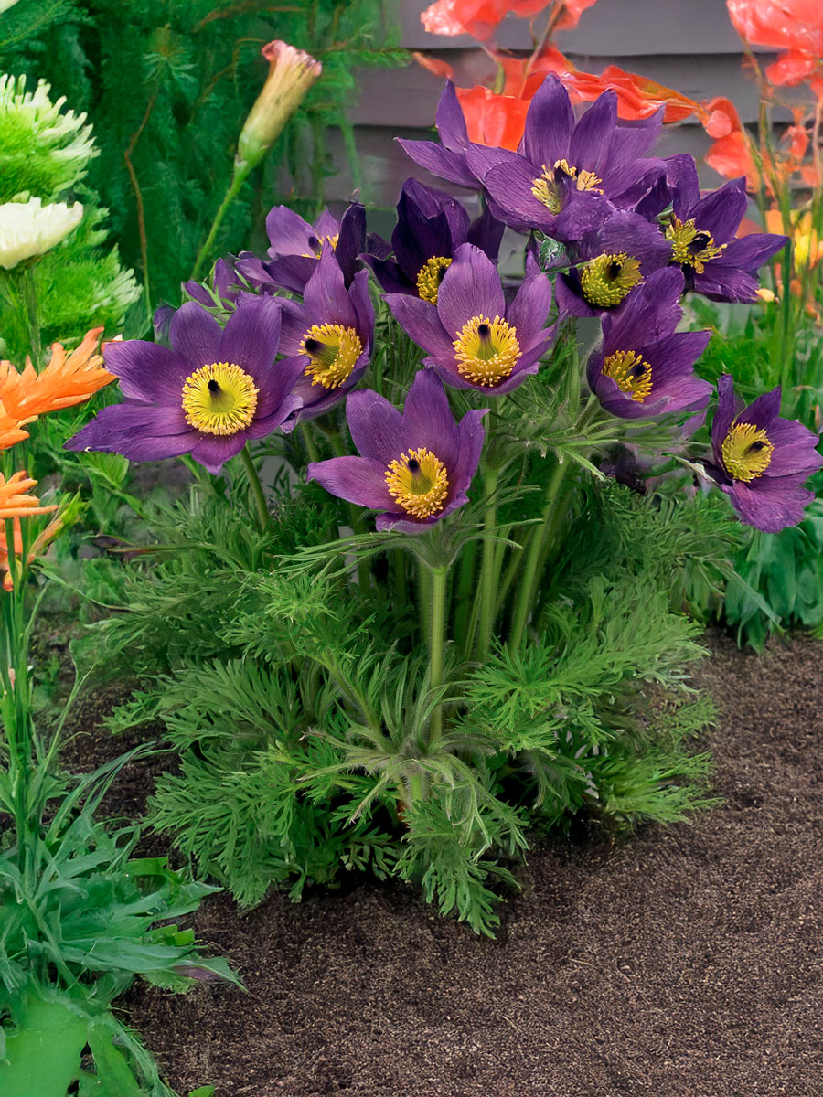 Декоративный красивоцветущий многолетник для теневого сада. Раннецветущий неприхотливый многолетник. Трогательные пушистые цветы фиолетовой окраски с контрастными ярко-желтыми тычинками и ажурной листвой. Высота 20-30 см. Купить саженцы Прострела/Сон трава.