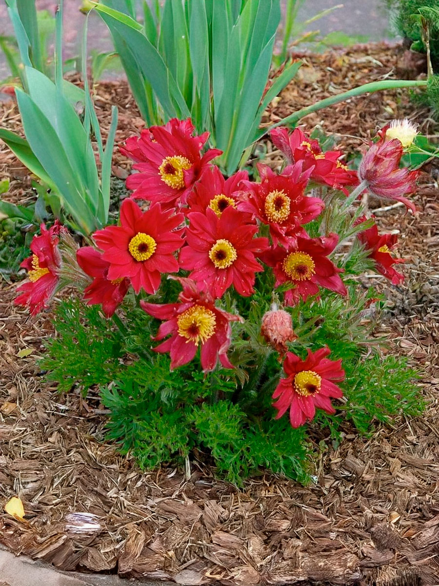 Многолетнее растение с мелкими, зелёными листьями. Цветки крупные, красные, с жёлтым центром. Цветение с апреля по май. После цветения прострел остаётся декоративным до поздней осени. Высота 20- 25 см Купить саженцы Прострела/Сон трава.